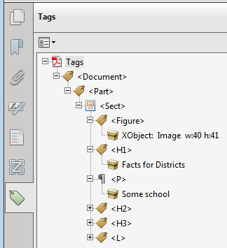 When people talk about "accessible" PDF files, they usually are referring to "tagged" PDF files, even though there is more to an accessible PDF than tags. PDF tags provide a hidden structured, textual representation of the PDF content that is presented to screen readers. They exist for accessibility purposes only and have no visible effect on the PDF file.